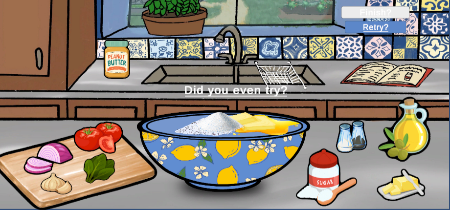 For our last iteration of Tomato Sauce Maker Pro, we focused on upgrading some of the art for the game, some of the writing for different unlockable endings, and bug fixes. To make the game a bit more challenging, we edited the recipe book to only give the players a hint of recipes without giving away the whole answer. The different endings will hopefully motivate players to try every combination of sauce ingredients and pasta making ingredients to see what happens. By also implementing an easy mode and hard mode, players can experience the game at their own pace and comfort level. We had so much fun making this game. Thank you for playing Tomato Sauce Maker Pro!